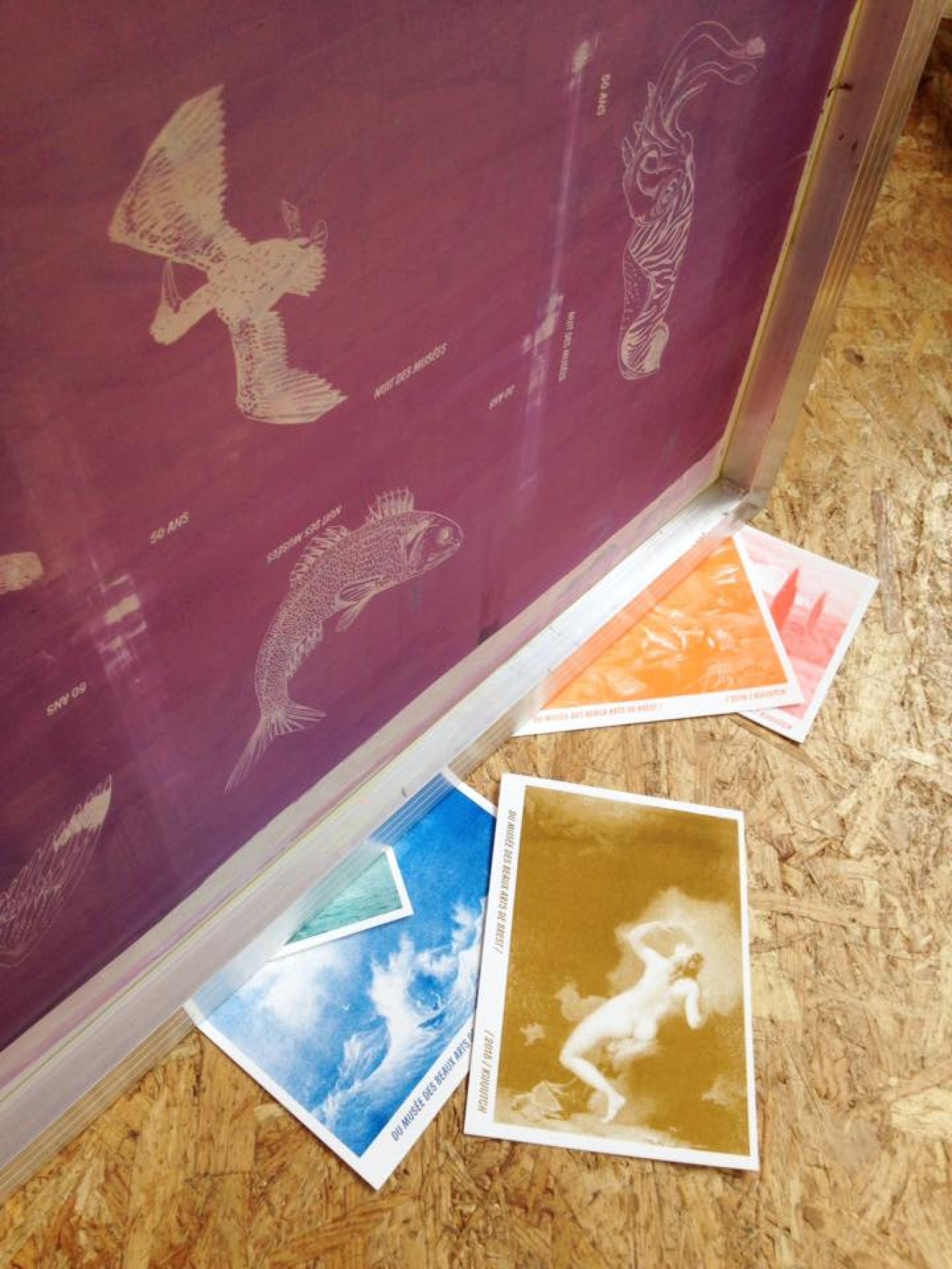 Ateliers de coloriage sur cartes postales, reprenant les œuvres majeures du musées et de sérigraphie sur papiers pré-imprimés en risographie.