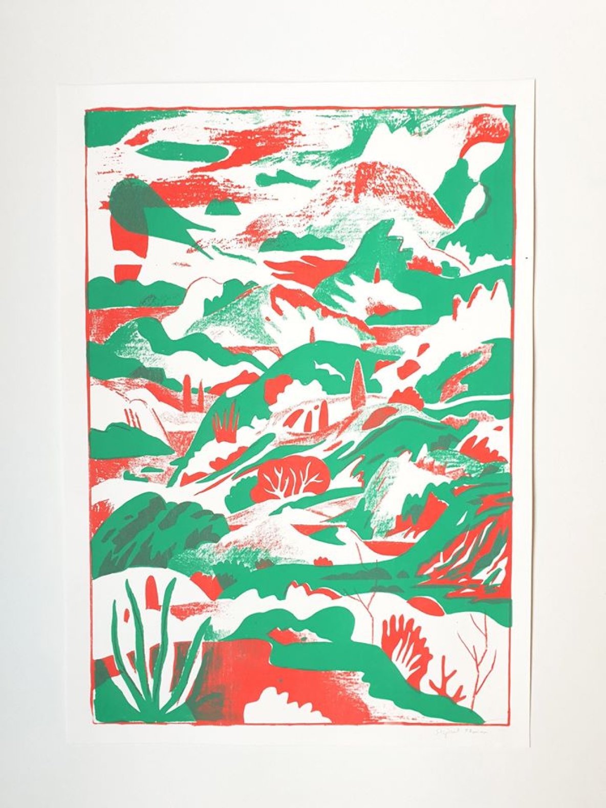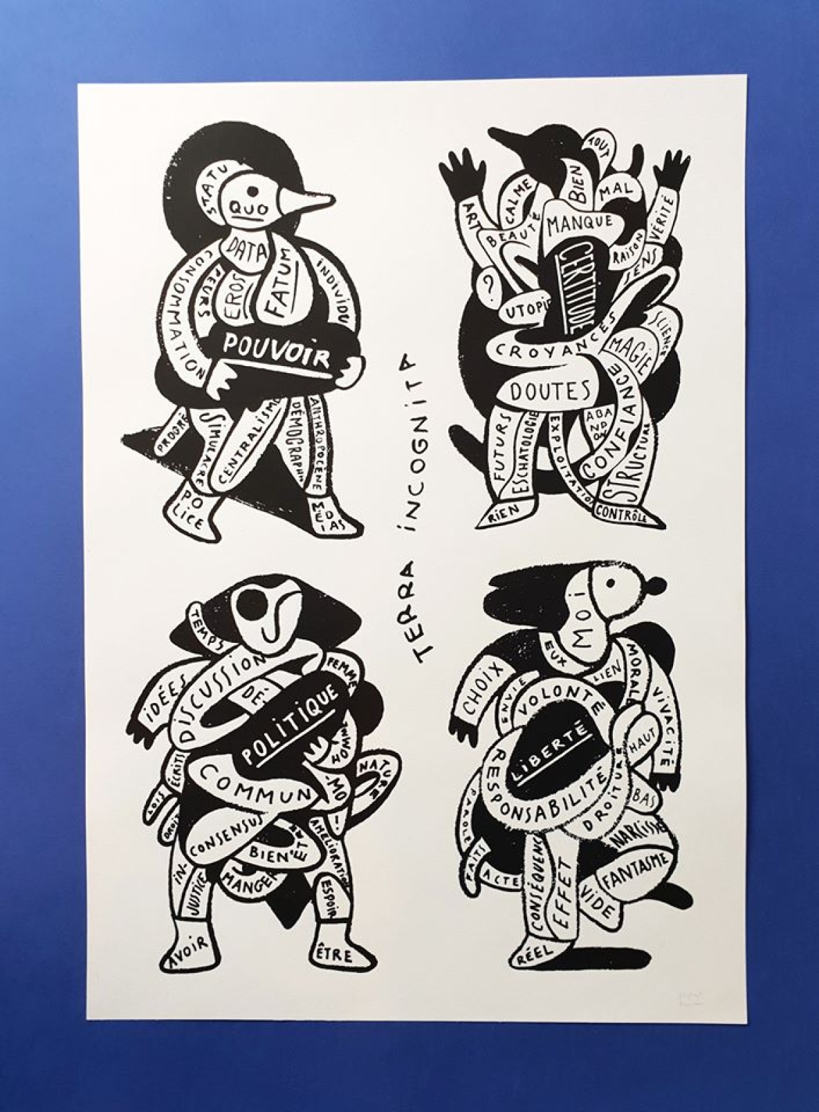 » Un jour je me suis aperçu que recouvrir de bleu un jaune donnait du vert. Depuis je tente un peu chaque jour de découvrir ce qui là-dedans m’a énormément plu. Les images que je fabrique ne sont pas destinées à être sérigraphiées après-coup, je les réalise pour les sérigraphier. C’est le mélange de couleurs qui est à la base de tout. Très souvent je dessine mes couches à même les calques au fur et à mesure de l’impression. Une fois une couleur imprimée, je décide de ce que je vais rajouter par-dessus. N’étant pas vraiment un coloriste, j’apprends à chaque passage… «